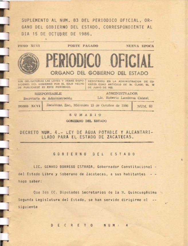 La Junta Intermunicipal de Agua Potable, Alcantarillado y Saneamiento de Zacatecas (JIAPAZ) nace mediante la publicación de un decreto en 1986.