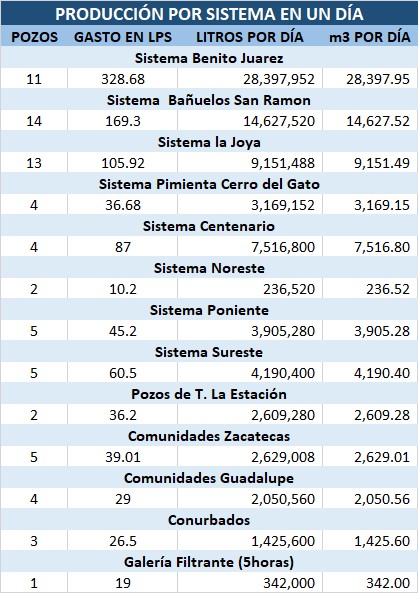 Estas fuentes se agrupan en Sistemas de Abastecimiento, que se componen por un conjunto de pozos, tanques, rebombeos y líneas de conducción que van a un determinado grupo de colonias.